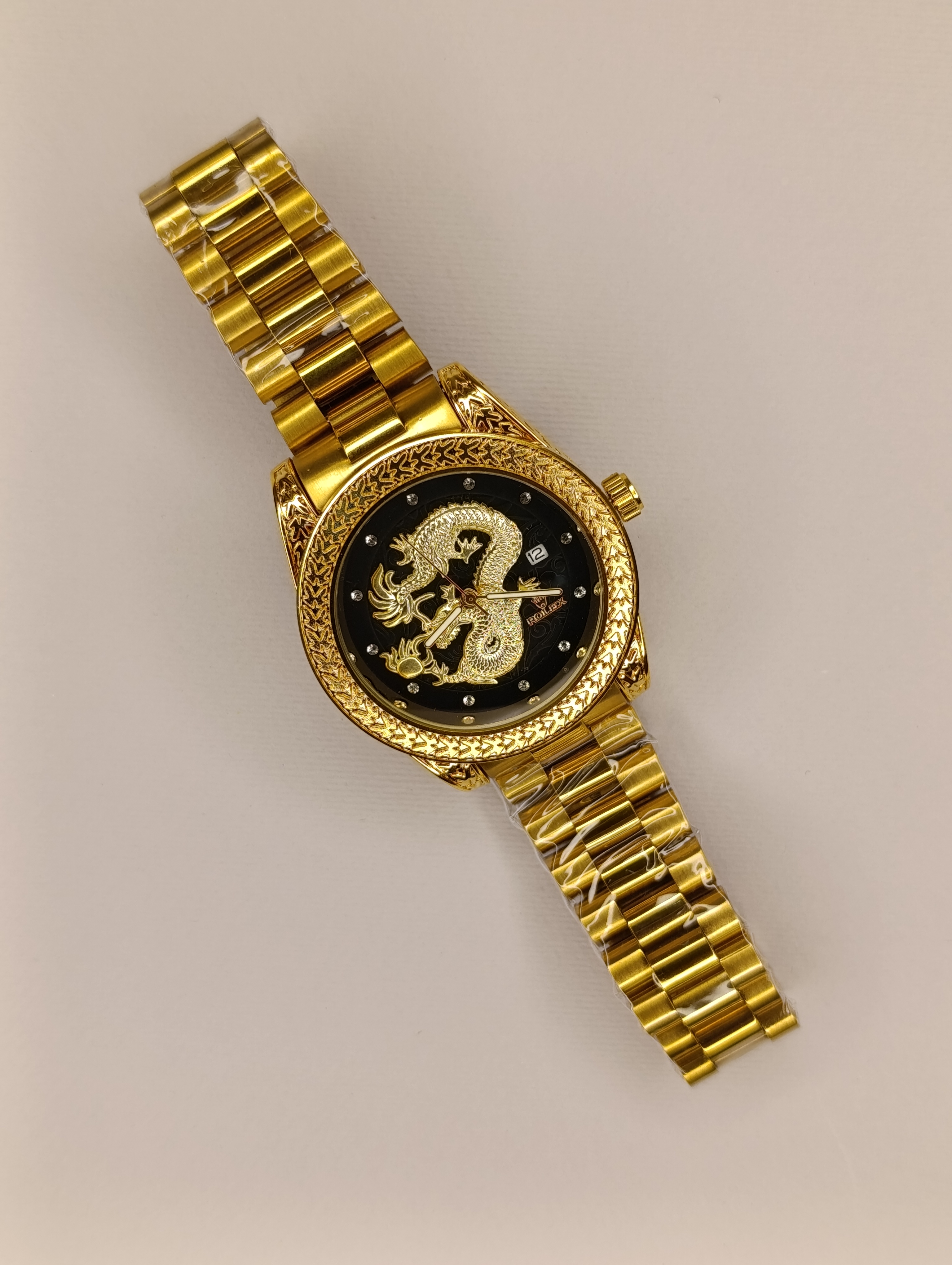 ساعت رولکس دراگون صفحه نگین کاری تقویم فعال رنگ ثابت ضد زنگ طلایی حکاکی مارک رولکس روی دسته و پیم