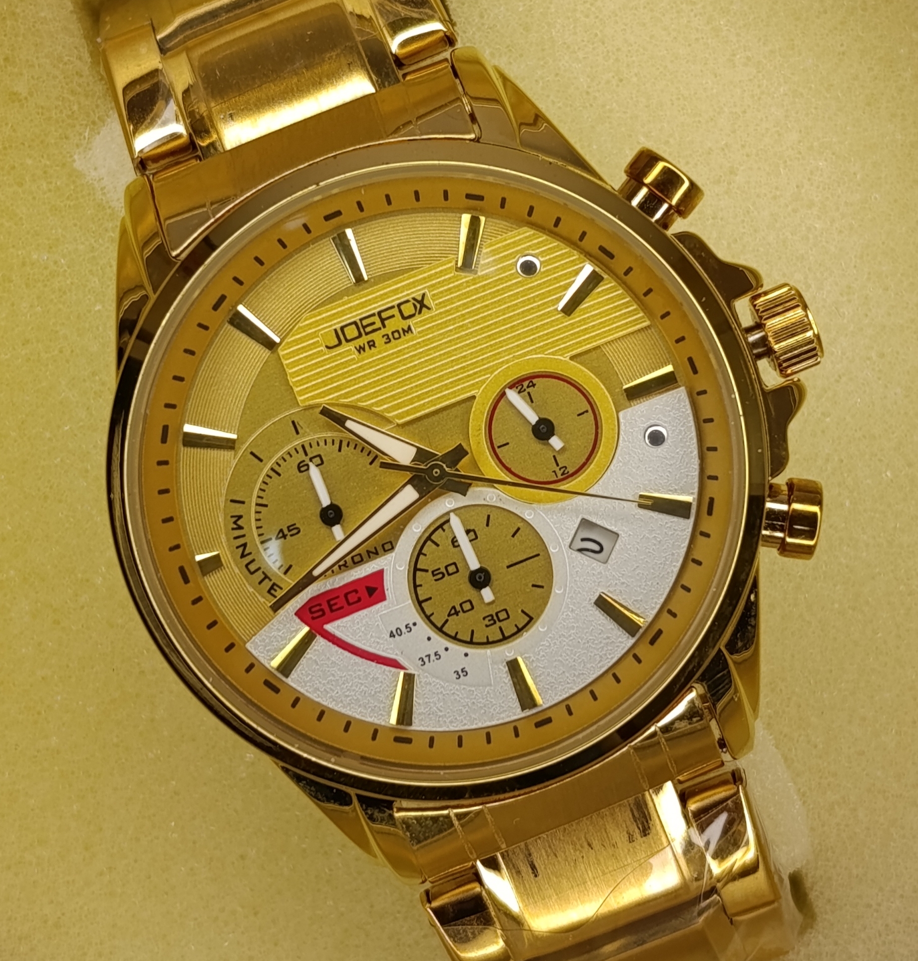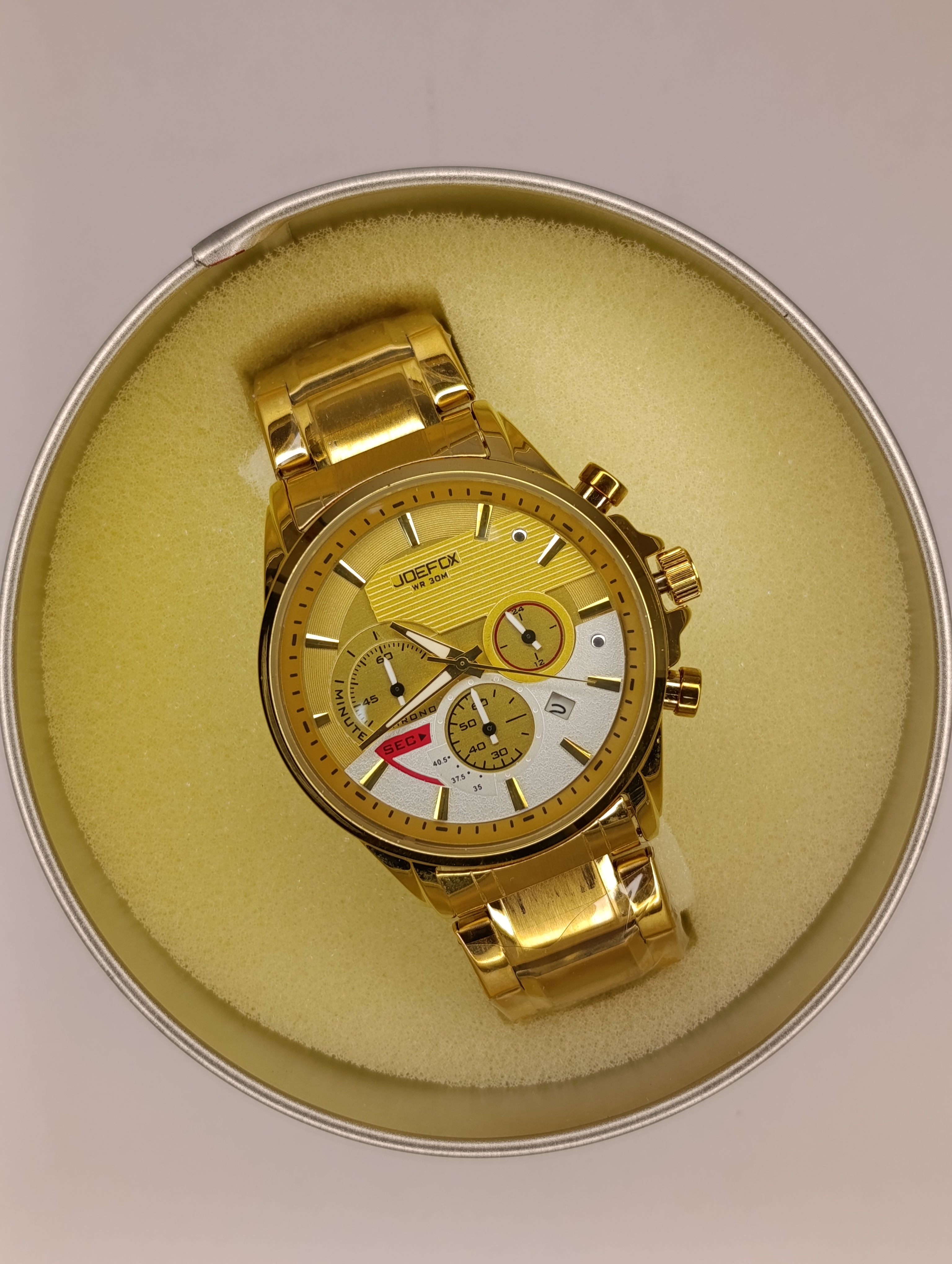 ساعت مردانه جافکس joefox کرنوگراف سه موتور فعال اورجینال شرکتی جنس بند و بدنه استیل با جعبه آلمینیوم مخصوص شرکتی جافکس